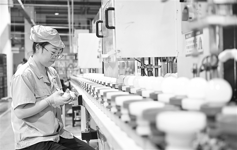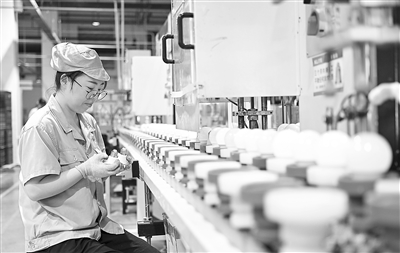 近年来,位于瑞昌市的江西凯耀照明有限公司通过新增设备、引进新型产品生产线等举措,建成200余条自动化生产线,实现日产球泡灯100万只。图为7月23日,员工在自动化生产线巡检。