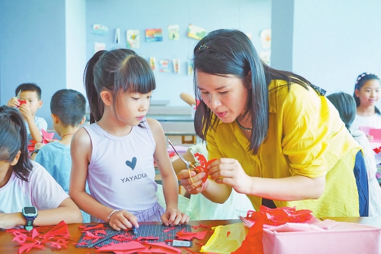 县文化馆馆长黄振荣站在回廊,看着沉浸在兴趣中的孩子们,眼中满是欣慰。他说:“寒暑假开设的剪纸、架子鼓、中国舞等项目,趣味性强、容易上手。孩子的需求,就是我们努力的方向。有兴趣作引,他们才会走进艺术与非遗的天地。”在他看来,文化馆播下的是文化自信的种子。