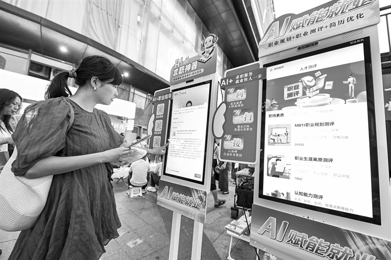 7月24日,在南昌市青云谱区徐家坊街道“洪漂人才荟”夏季夜市招聘会上,应聘者在“智慧就业服务AI一体机”上体验AI功能。通讯员 鲍赣生摄