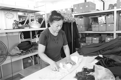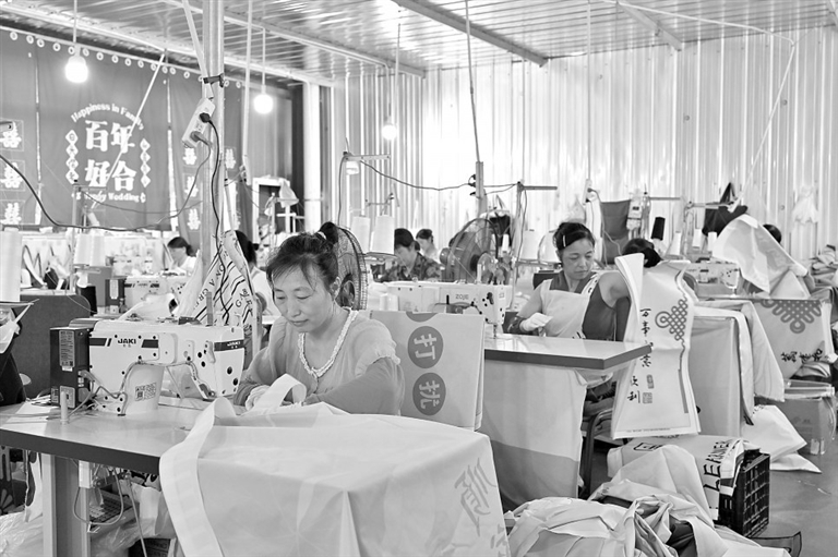 近年来,德兴市新岗山镇体泉村积极发展电商行业,现有布艺加工厂20多家,带动1000多名村民在家门口就业。图为7月12日,在体泉村齐氏布艺加工厂,村民正在加工布艺产品。本报全媒体记者 王蕴蓉摄