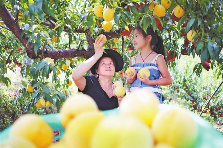 近年来,宜春市袁州区南庙镇引导农民充分发挥富硒土壤资源优势,因地制宜利用山地种植特色富硒水果,吸引游客采摘,促农增收。图为7月26日,游客在南庙镇双田村裕圣黄桃种植基地体验采摘乐趣。