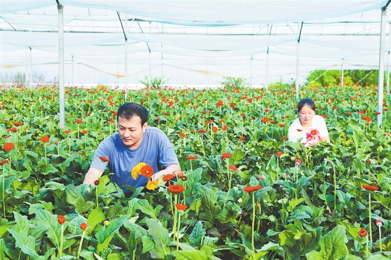 近日,在宁都县田头镇璜山村近百亩鲜花种植基地里,村民正在采摘非洲菊。近年来,宁都县瞄准花卉市场需求,通过“龙头企业+公司+基地”等生产经营模式,因地制宜发展特色花卉产业,带动农民增收致富,助力乡村振兴。本报全媒体记者 杨文斌摄