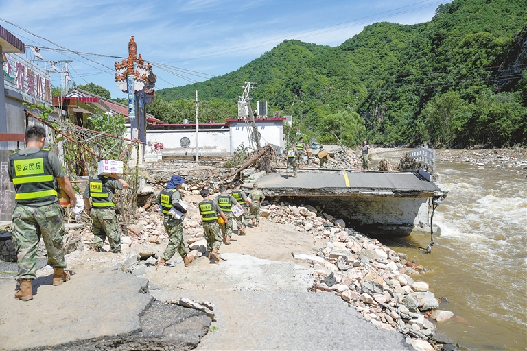 近日,北京密云等区遭遇特大暴雨,多个乡镇受灾。密云区冯家峪镇部分村庄的道路仍未恢复,有关部门组织消防、民兵等多支救援力量,将救灾物资徒步运送到村,保障受灾村民的生活需求。