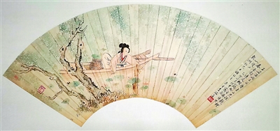 此画右侧题有一首诗:“玉姿温润不留尘,古水光摇镜里春。合面莲花相窃盼(眄),自怜绝世一双人。”此为新罗山人华喦诗稿《题丽人玩镜》,原意是描写美人伤春、顾影自怜,放在这里也合适,似乎对画中人物情感境界的表达有了进一步的升华。此画落款人为“叔平李端善”。李端善,字叔平,号端湖,北京人,从学于金北楼,工花卉、虫鸟。金北楼即金城,是民国初期北京画坛领袖,“湖社画会”创立者之一。李端善作为“湖社画会”中并不显山露水的一员,他的这件扇面,或可代表当时北方京津地区的绘画风格和水平。