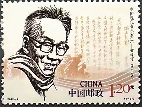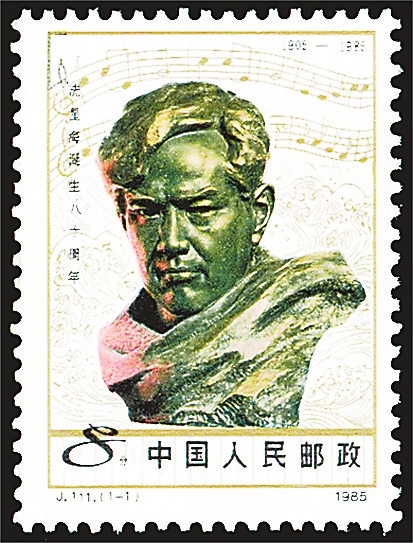 中国邮政1985年发行《冼星海诞生八十周年》邮票,画面是音乐家冼星海的铜像,背景是象征黄河的波涛与《黄河大合唱》的部分曲谱(如图)。《黄河大合唱》展现了抗日战争的壮丽图景,塑造了中华民族巨人般的英雄形象,成为中国音乐史上的经典之作。