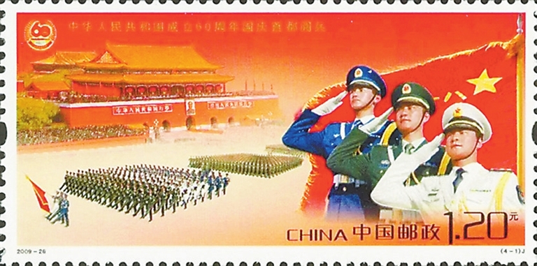 1939年冬,《八路军进行曲》在延安中央大礼堂首演。中国邮政1964年发行的《革命圣地——延安》邮票第二枚就是绿树掩映下的中央大礼堂。琅琅上口的歌词,热情豪迈的曲调,正是从这里唱响后,在各抗日根据地传唱。抗日战争胜利后,这首歌更名为《中国人民解放军进行曲》,后又被确定为《中国人民解放军军歌》。历次首都阅兵分列式上演奏的《分列式进行曲》,也是改编自这首军歌。中国邮政2009年发行《中华人民共和国成立60周年国庆首都阅兵》邮票(如图),展现的就是受阅方队伴随着旋律流畅、音调坚实、节拍规整的进行曲走过天安门广场的英姿,充分展现出人民军队豪迈雄壮的军威,以及一往无前的战斗风格和摧枯拉朽的强大力量。从英雄城南昌走出的人民军队,高唱着军歌从胜利走向新的胜利。