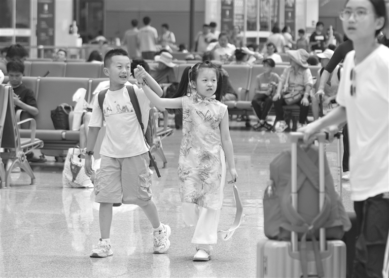 8月1日,两名小朋友在贵阳北站候车大厅。