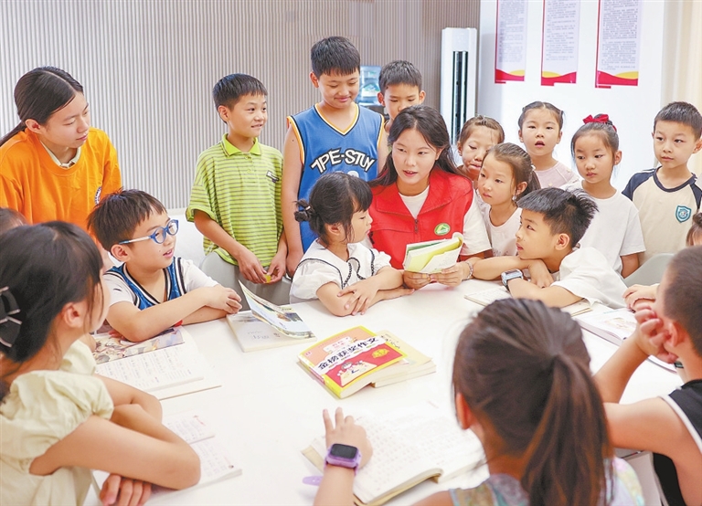 今年3月,万年县陈营镇首个以服务商圈及新就业群体为主的党群服务中心建成投用,覆盖600家商户及小微企业。图为7月29日,青年志愿者在与该县珍珠城商圈毗邻的党群服务中心“邻家课堂”,和孩子们一起阅读。特约通讯员 徐声高摄