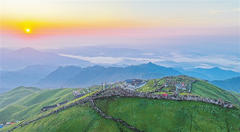 8月1日,萍乡武功山风景名胜区云海翻涌,日出绚烂,美如画卷,吸引众多游客前来观赏。本报全媒体记者 张翰林摄