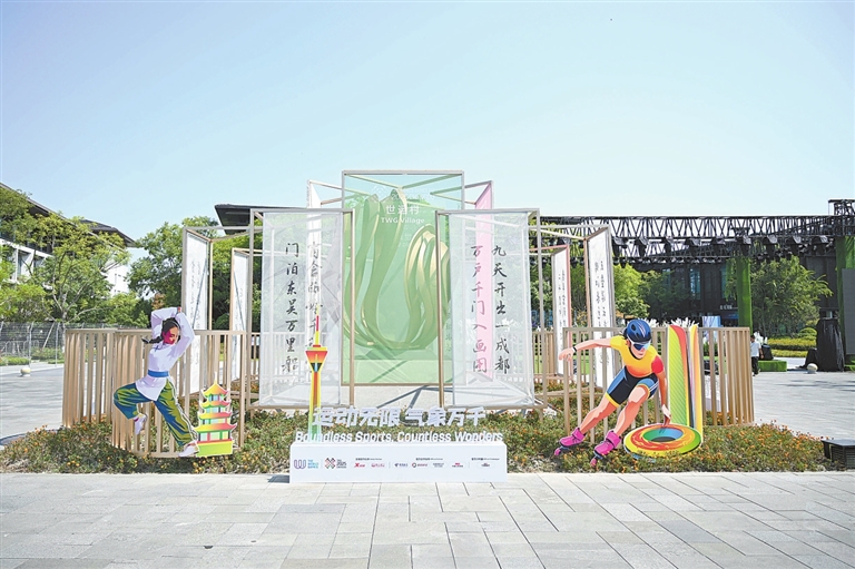 这是8月3日在成都世运会运动员村内拍摄的文化活动区。当日,2025年第12届世界运动会运动员村正式开村。据悉,成都世运会运动员村分为A、B两区,均为既有酒店设施布置,运行时间为2025年8月3日至8月18日,预计将为约7000名参赛者提供注册、医疗、餐饮、文化体验、商业休闲、物流等服务。 新华社记者 胥冰洁摄