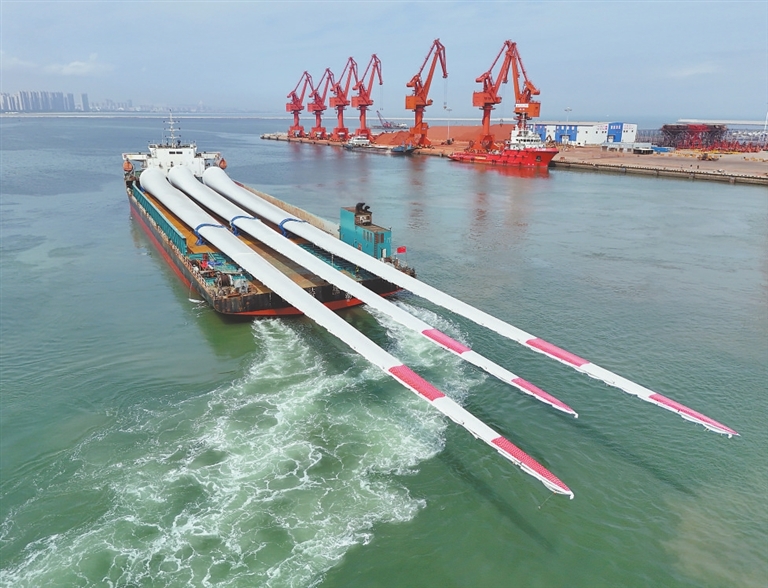 8月1日,超大尺寸海上风电叶片从山东港口烟台港蓬莱港区起运(无人机照片)。8月1日,三支超大尺寸海上风力发电机试验叶片在山东港口烟台港蓬莱港区完成装船并运往试验基地。该型叶片长达153米,重83.5吨,属于150米级超大尺寸海上风电叶片,现已完成全部静力测试,即将在试验基地进行疲劳测试验证。 新华社发(唐 克摄)