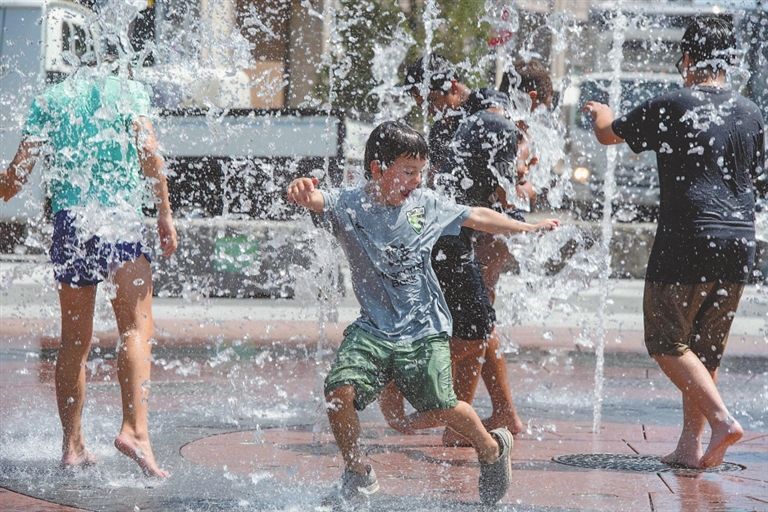7月29日,在美国马萨诸塞州埃弗里特,人们在喷泉处戏水降温。新华社/法新