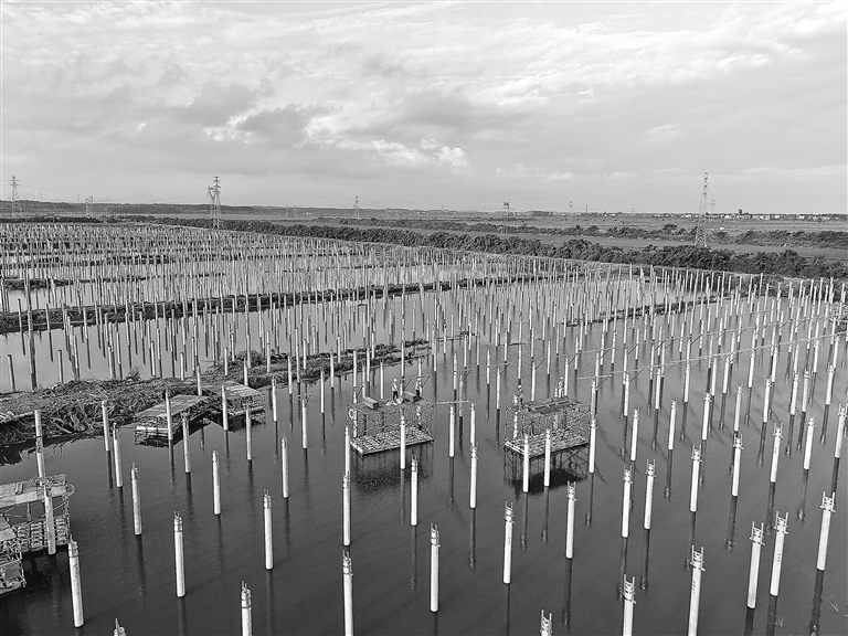 ▲7月29日清晨,在赣江新区新祺周管理处桑海集团江夏分场60兆瓦渔光互补光伏发电项目施工现场,工人们错时施工,稳步推进施工进度。该项目占地1000亩,建成后年均发电量约6600万千瓦时。通讯员 袁 骏摄