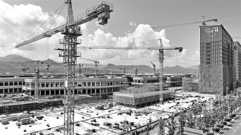 ◀8月2日,遂川县专业市场施工现场,塔吊擎天,一派繁忙。建设者们错时施工,避过正午暑热,确保项目建设有序推进。