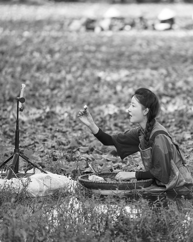近年来,分宜县本土电商人才纷纷走进田间地头,开展直播助农活动。图为8月5日,该县凤阳镇千亩菱角种植基地,网络主播在帮助农户销售菱角。本报全媒体记者 邹宇波摄
