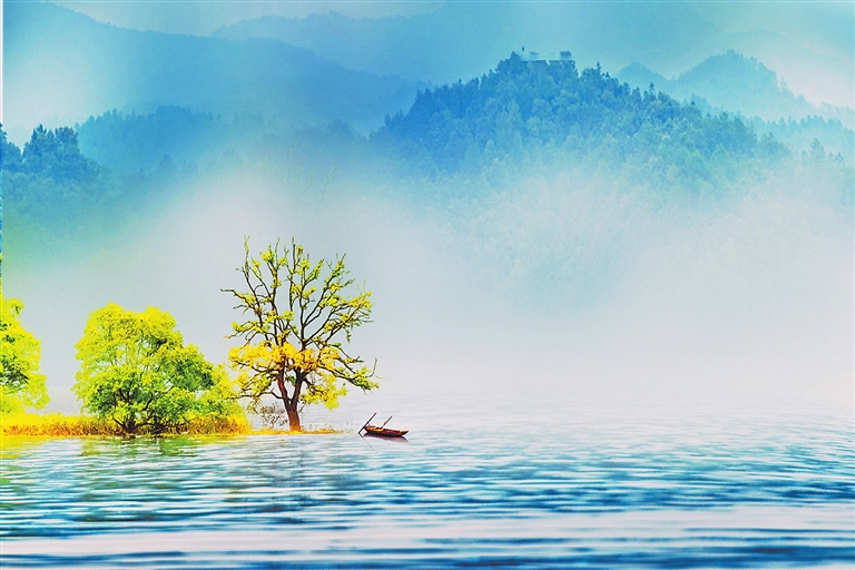 近日,吉安市万安县万安湖景区,清晨薄雾笼罩,湖面泛起粼粼波光,湖边的小树、湖中的小船,与远处若隐若现的青山构成一幅水墨画。