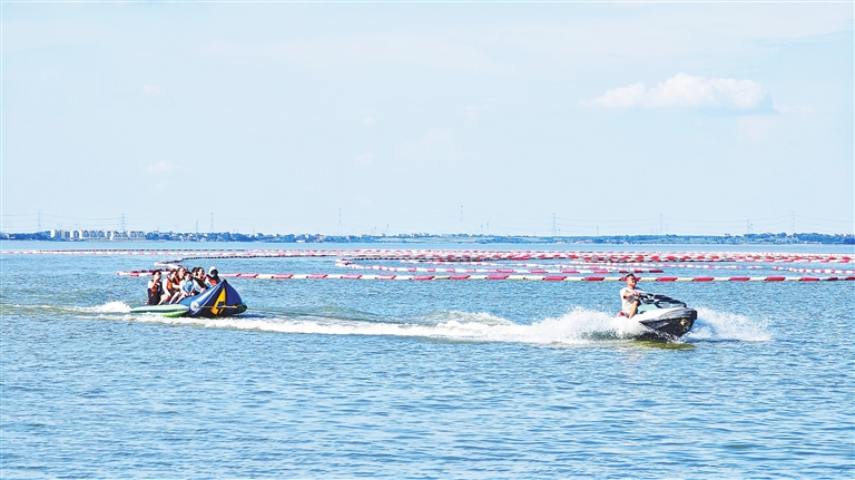 进贤县充分利用军山湖优质水资源优势,做好水文章,促进文旅体融合发展。图为8月5日,在三阳集乡军山湖水世界,游客正在体验水上游乐项目。