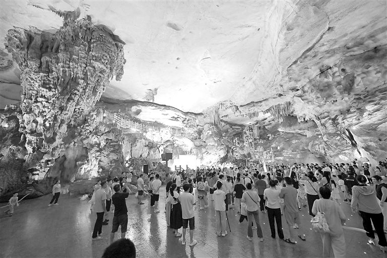 新余市仙女湖区的洪阳洞景区持续创新体验形式,进一步丰富游客的游玩趣味性。图为8月3日,游客在清凉的溶洞内游玩避暑。