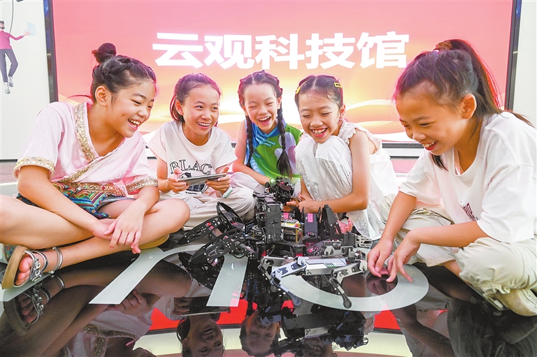 8月5日,南昌市三家店街道云观科技馆暑假公益课堂,青年志愿者为孩子们带来一场别开生面的科技知识科普课。图为当日,孩子们在操控机器狗。