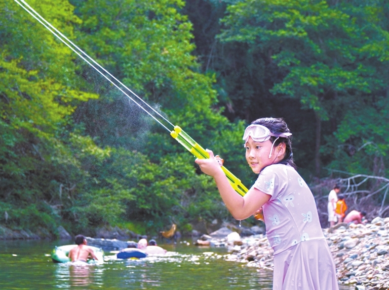 盛夏,武宁县宋溪镇伊山村周边的天然溯溪成为游客避暑纳凉、亲近自然的理想之地。图为8月4日,孩子们在家长陪同下在天然溯溪玩水,享受清凉时光。