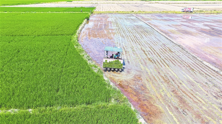 8月4日,在吉安市吉州区曲濑镇水南村水稻种植基地,农机手驾驶插秧机抢插晚稻。