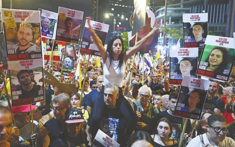 8月9日,以色列民众手持被扣押人员的海报在特拉维夫参加游行集会。数以万计以色列民众9日晚在位于特拉维夫的以国防军总部前举行大规模游行集会,抗议以军接管加沙地带北部加沙城计划,要求迅速结束在加沙地带的战争。一个代表大多数被扣押人员家属的团体当晚发表声明说,超过10万人参加了游行集会。新华社发(贾马尔·阿瓦德摄)