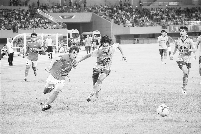 压题图:8月10日晚,在赣州市全民健身中心体育场,双方队员激烈拼抢。本报全媒体记者 徐 铮摄
