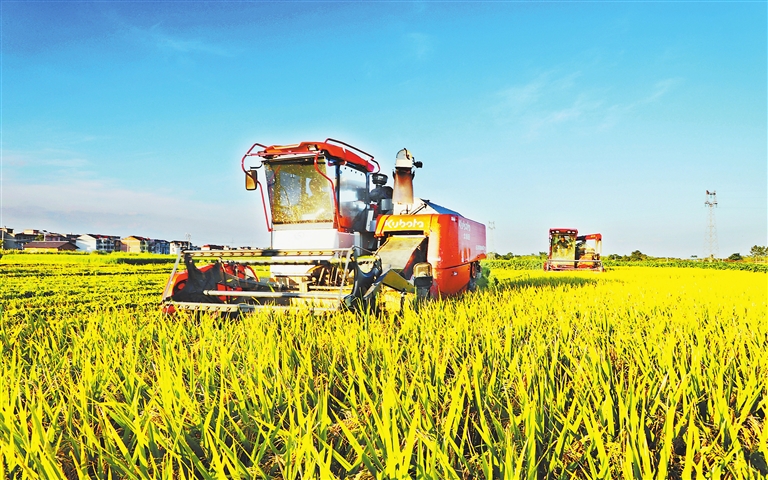 眼下,新余市15万亩再生稻迎来丰收季,当地农民抢抓晴好天气加紧收割,田间地头一派繁忙景象。图为8月11日,在该市渝水区珠珊镇丰溪村高标准农田,农机手驾驶农机收割再生稻。通讯员 廖海金摄