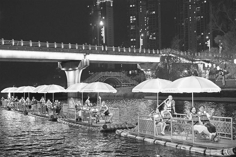 修水县“龙游修水” 项目融合自然风光与深厚人文底蕴,乘坐光影竹筏穿梭在波光粼粼的河面上,仿佛踏入一条流动的文化长廊。图为8月7日,游客乘坐竹筏游览修河两岸的光影画卷。