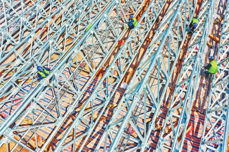 赣州北500千伏变电站新建工程是省“十四五”电网建设重点工程,目前进入主体施工阶段,全部工程预计2026年6月竣工投运,建成后将进一步完善赣州电网结构,提升供电可靠性。图为8月9日,施工人员在进行高压场地构架拼装,为后续吊装做准备。