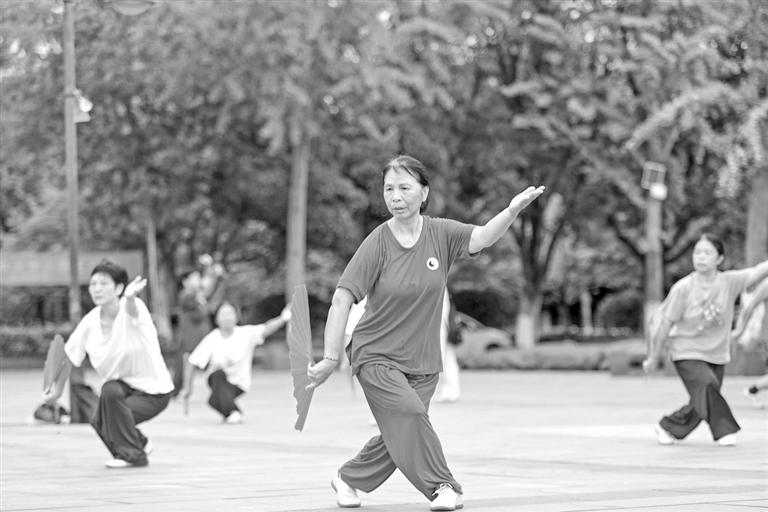 近年来,峡江县全民健身事业快速发展,群众纷纷走出家门,享受运动带来的乐趣。图为8月6日,太极爱好者在百花公园打太极扇。特约通讯员 陈福平摄