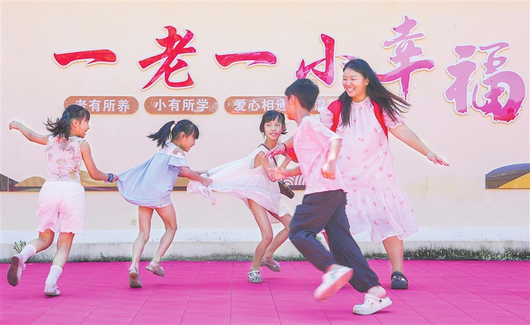 暑假期间,南丰县以“童伴妈妈+党员志愿者”为抓手,为留守儿童开展课余辅导、亲情陪伴、心理疏导、安全教育等关爱服务,丰富孩子们的暑期生活。图为8月8日,琴城镇朝先村“一老一小”幸福院内,志愿者和留守儿童正在玩趣味游戏。通讯员 谢 东摄