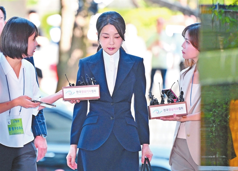 8月12日,在韩国首尔,韩国前总统尹锡悦妻子金建希(中)抵达法院。新华社/法新
