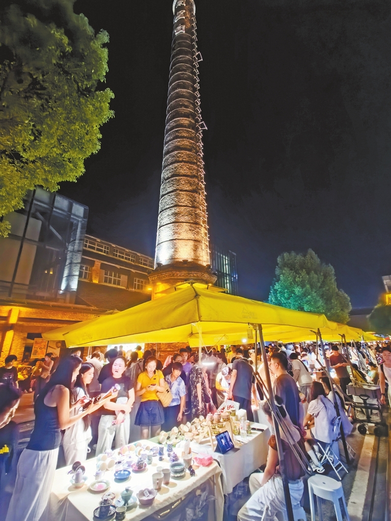 8月8日晚,景德镇市陶溪川文创街区热闹非凡,创意集市灯光星星点点,各种瓷艺精品琳琅满目,吸引许多游客前来选购。