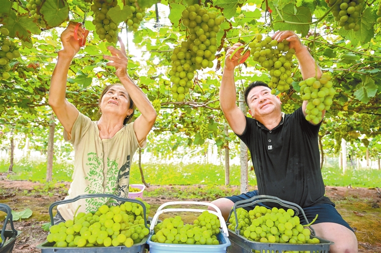 奉新县赤田镇祠堂村俊杰生态园120亩葡萄喜获丰收。图为8月12日,农民在采收葡萄供应市场。通讯员 黄 胜摄
