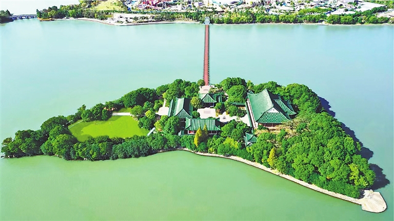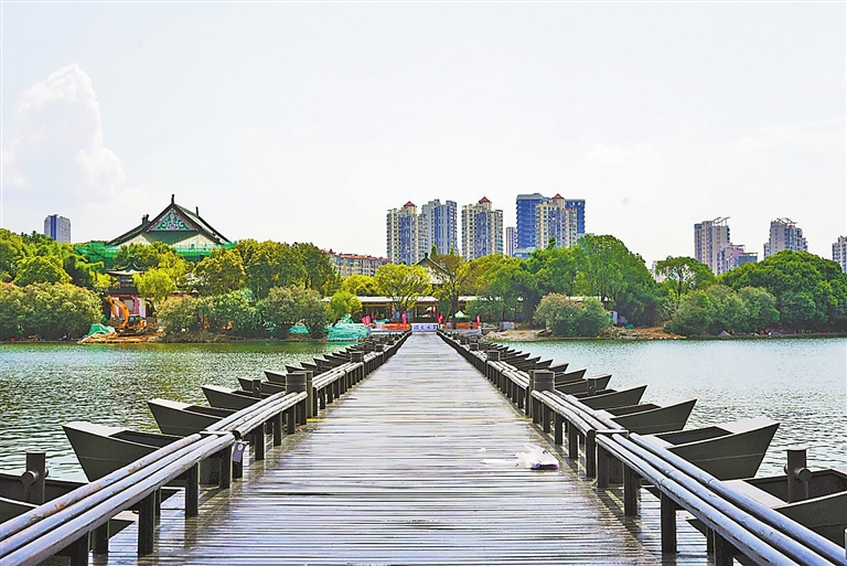 “项目总用地范围面积约1.9万平方米,总建筑面积4136.53平方米,主要建设内容包含岛上区域的建筑外立面修缮、室内装饰、环境提升改造、室外管线改造及相关配套工程。”项目建设现场负责人、中建五局工作人员张孟江介绍,豫章书院的改造工程保留了原建筑的仿古特色,绿色屋顶与岛内绿植相映成趣,且以不影响水域环境为目标修建水上浮桥,让登岛入书院变得更便捷,形成了“院在景中,景落岛内,岛于湖心”的整体格局。