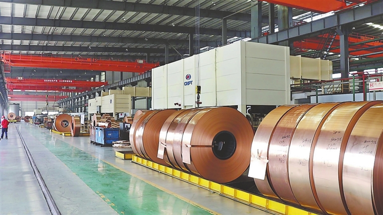 江西科美格新材料有限公司生产车间,一卷卷锡磷青铜板带依次摆放。本报全媒体记者 陈 晖摄