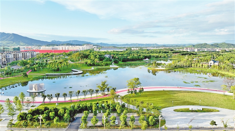 近年来,分宜县充分利用城市中的天然湿地与闲置边角地建设湿地公园,提高市民生活品质。图为8月15日,航拍下的分宜县天工湖湿地公园。特约通讯员 袁建兵摄