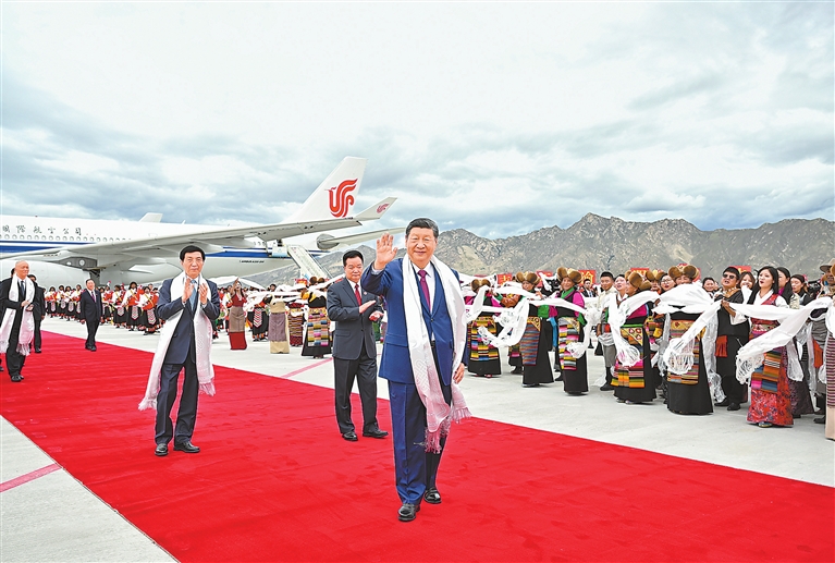 西藏自治区党委书记王君正、自治区人大常委会主任严金海、自治区人民政府主席嘎玛泽登、自治区政协党组书记刘江等在舷梯下迎候。习近平走下舷梯时,王君正敬献哈达,礼仪人员敬献切玛和青稞酒。各族群众代表身着节日盛装,挥动红旗和五彩花束,跳起欢快的民族舞蹈,欢迎总书记的到来,表达对总书记的衷心祝福。