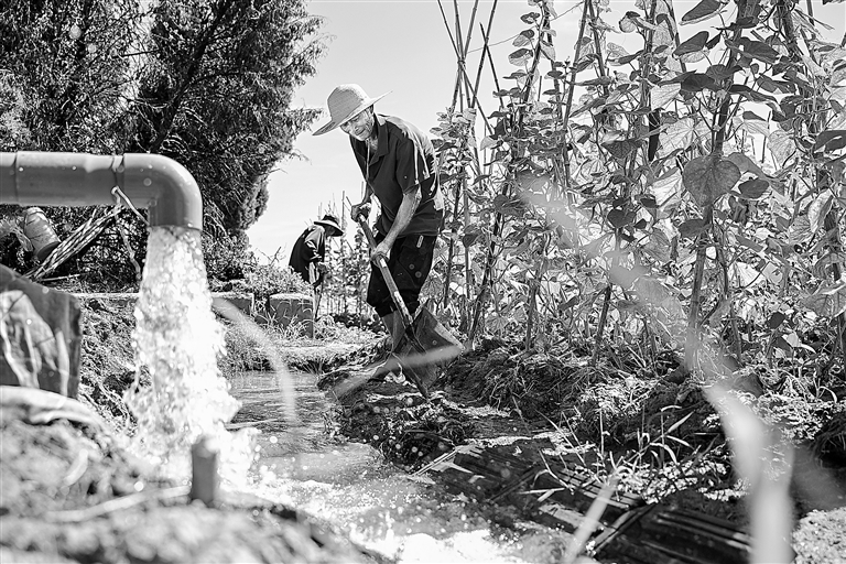 连日来,我省持续高温晴热天气,部分地区农田出现缺水状况,多地已启动提灌站提水、钻井取水等措施,确保农田灌溉用水。图为8月20日,在南昌市东湖区扬子洲镇上房村,村民通过钻井取水给土地浇灌。本报全媒体记者 洪子波摄