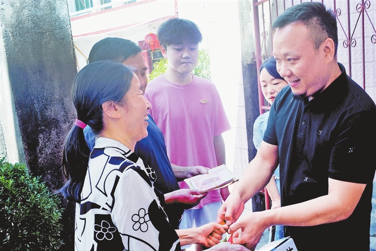 8月17日,德兴市德乐智能科技有限公司总经理郑智刚(右一)来到新岗山镇新建村学子程志超家中,送去1万元爱心助学金。近年来,郑智刚共结对资助了23名品学兼优、家庭相对困难的大学生。