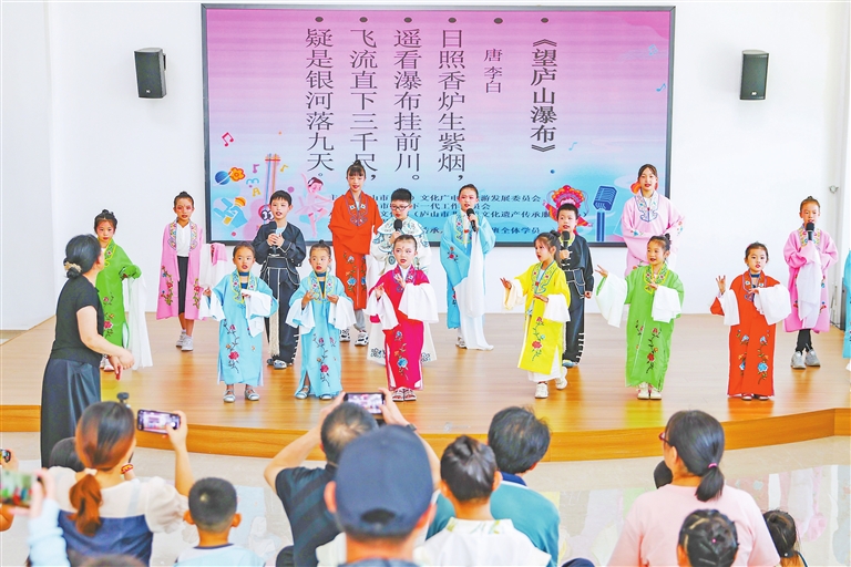 暑假期间,庐山市积极开展形式多样的托管服务,缓解暑期孩子“看护难”问题,同时丰富了学生假期生活。图为8月12日,庐山市庐山文化馆内,西河戏小小传承人公益培训班的学员正在进行汇报演出。特约通讯员 韩俊烜摄