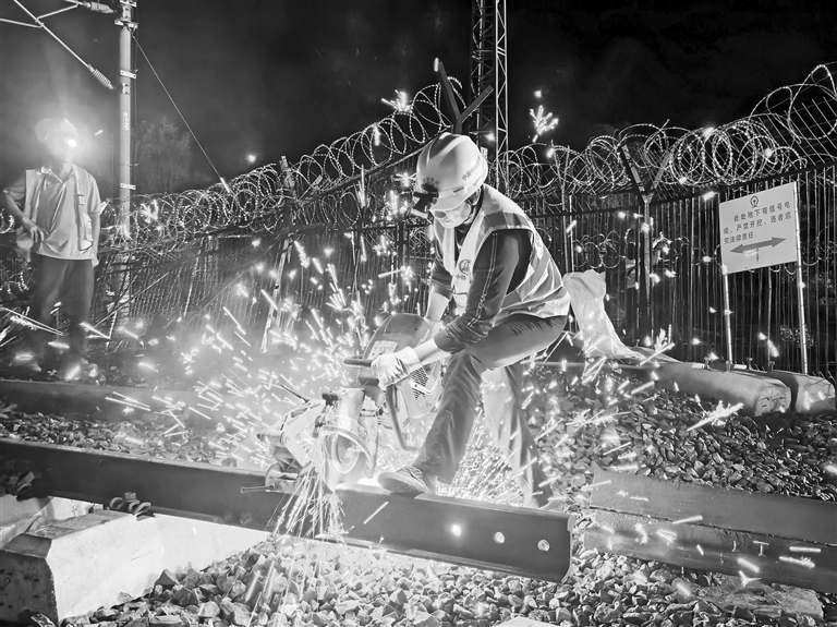 8月21日凌晨2时许,在瑞金火车站改造工程道岔插铺施工现场,工人正在进行道岔合龙口钢轨切割作业。目前,瑞金火车站新66#道岔已顺利插铺就位,为下一步瑞梅铁路铺轨创造了条件。刘新权摄
