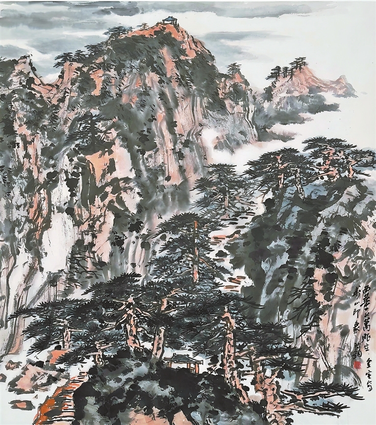买鸿钧的中国画《西华一上万眼空》(图1)与张晓凌的批评文字构成互文场域。张晓凌“游观南北、笔意纵横”的解读,在笔墨语言中寻得依据:斧劈皴塑造的山体结构与泼墨渲染的云气交融,墨色勾勒的峰峦走向与淡赭皴擦的岩层肌理,以及画面中具象山脊与抽象云涛的辩证关系,呼应了“变法图强”的历史担当和“逍遥法外”的创新精神。