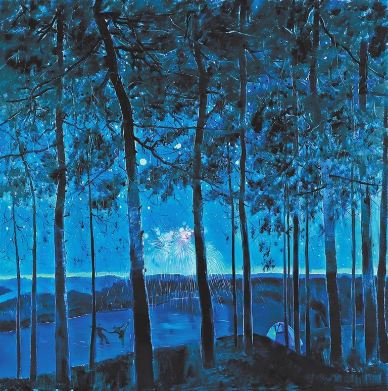 李江峰的油画《化象成境——节日》(图2)与刘礼宾的评论形成视觉对读。刘礼宾“‘人化自然’的规约与‘澄明之境’的纯化”的学术判断,在画面中获得具象诠释:树冠的钴蓝扫点体现主观提炼,烟火提亮形成视觉焦点,背景的薄蓝构建空间秩序。婆娑树影与色层结构,成为文本中“意象解码”的视觉载体。