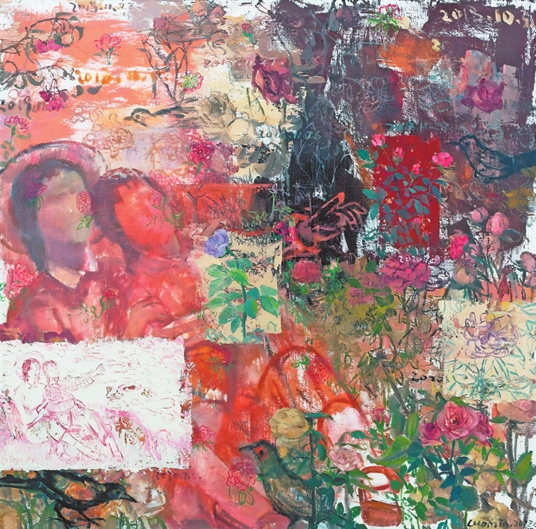 罗敏的油画《人民公园的秋天》(图3)与何桂彦的评论文本并置呈现。何桂彦“语言成为审美的踪迹”的论断直指画面特质:布面油彩厚重的笔触、类似“飞白”的痕迹、纯粹线性的表达,构成评论文本中“逸笔草草”的视觉实证。画面中草木的写意笔触与类似“拼贴”色块的交融,印证了评论所指“绘画是与自然的对话”的本质关联。