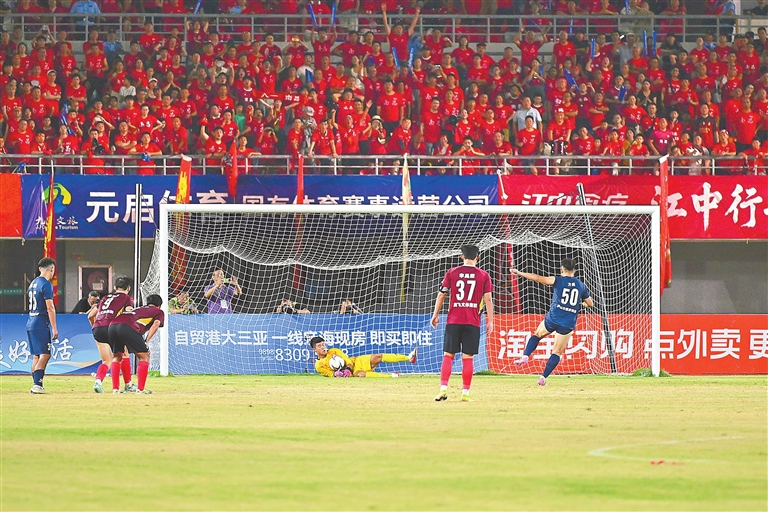 随后九江队猛烈反扑,持续施压南昌防线。补时阶段,南昌队球员在禁区内制造犯规,九江队获得点球机会。全场球迷屏息凝神,九江队前锋方亮主罚射门,南昌门将刘家祥奋勇扑出,将球挡在门外!关键扑救守住平局,客队看台瞬间沸腾,刘家祥也成为球队的“英雄”。