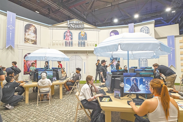 日前,参观者在德国科隆游戏展叠纸游戏展台试玩游戏《无限暖暖》。2025年科隆国际游戏展近日在德国科隆开幕。中国游戏企业参展规模和热度较去年进一步提升。中国游戏正以更自信的姿态走向欧洲市场。新华社记者 张 帆摄