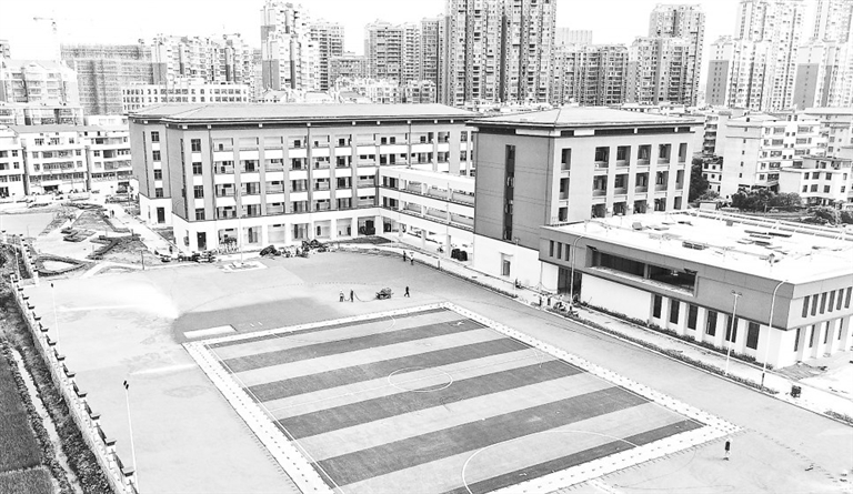 8月22日,会昌县第六小学新校区建设现场,工人正在铺设塑胶场地。特约通讯员 刘兆春摄