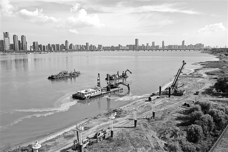 南昌市通过建设秋水广场客运停靠点,让市民、游客更加便捷乘坐游船感受“一江两岸”秀美风光。图为8月25日,在秋水广场客运停靠点施工现场,工人们正加紧建设。